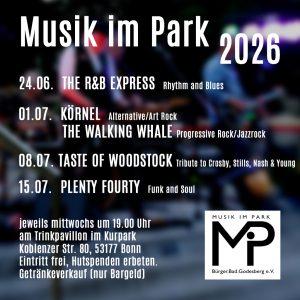 Bei uns ist was los. Wir organisieren mit Freude ein vielfältiges Angebot an Veranstaltungen. Wir geben Musikern und Musikerinnen eine Bühne und dem Publikum ein tolles Musikangebot. Im Sommer finden Konzerte im Rahmen „Musik im Park“ statt.