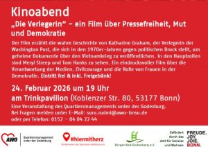 An diesem Abend lädt das QUARTIERSMANAGEMENT UNTER DER GODESBURG zu einem Filmabend mit evtl. anschließendem moderiertem Austausch ein. Der Film greift Themen rund um Demokratie und gesellschaftliches Miteinander auf und soll als Anlass dienen, mit interessierten Anwohnerinnen und Anwohnern ins Gespräch zu kommen.