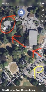 - Anfahrt zum Trinkpavillon von der Friedrich-Ebert-Straße aus durch den Kurpark ist nur zum Be- und Entladen erlaubt (siehe Luftbild unten). Die Rasenflächen dürfen nicht befahren werden und die Fahrzeuge dürfen während der Veranstaltung nicht im Park verbleiben. Öffentlicher kostenfreier Parkplatz gegenüber der Stadthalle (3 Minuten Fußweg). Vorsicht mit den Findlingen entlang der Wege.