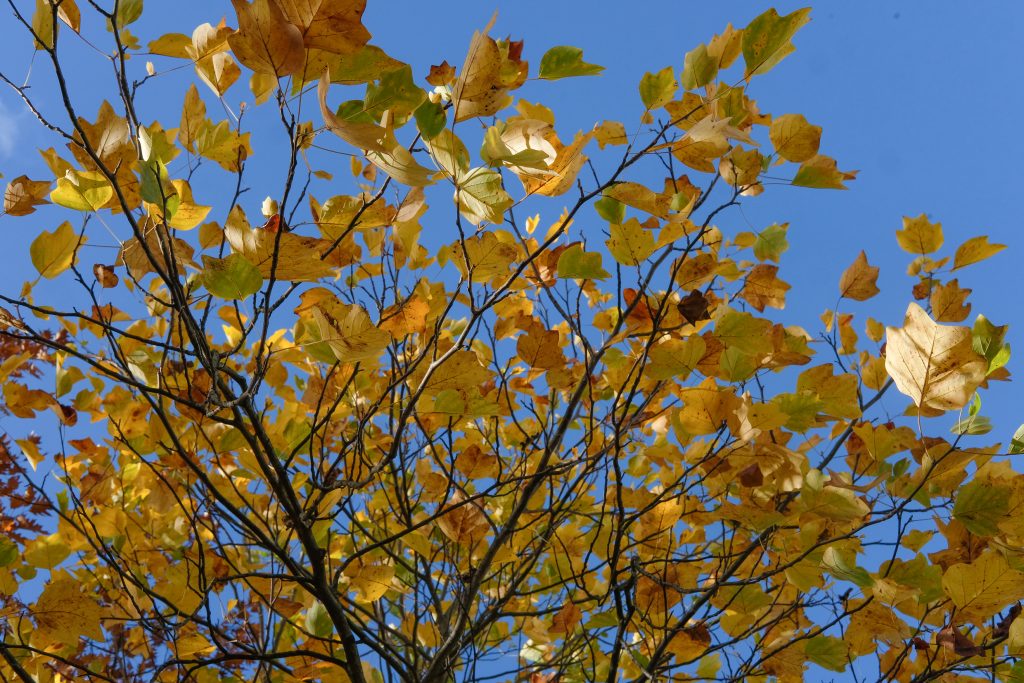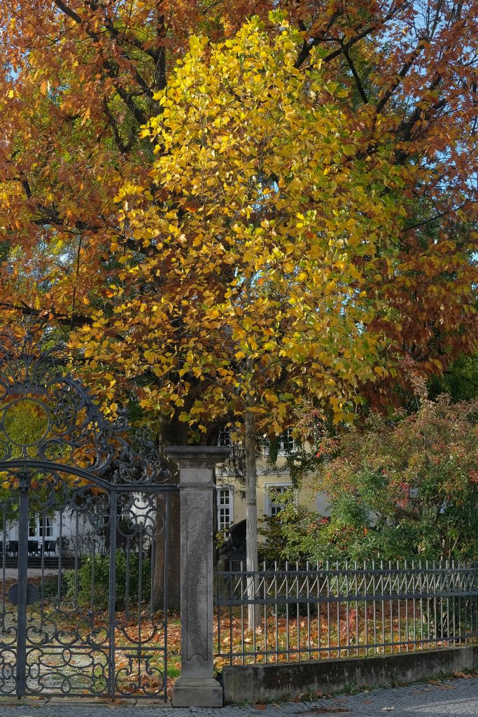 Blattform: auffallend ungewöhnlich mit geschwungenen Lappen und abgeschnittener Spitze, prachtvolle goldgelbe Herbstfärbung