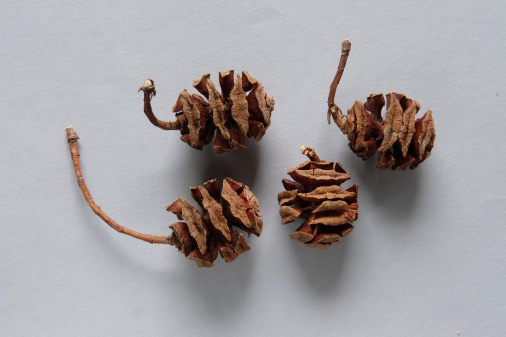Früchte: kugelig, dunkelbraun, bis 2,5 cm lang hängend.