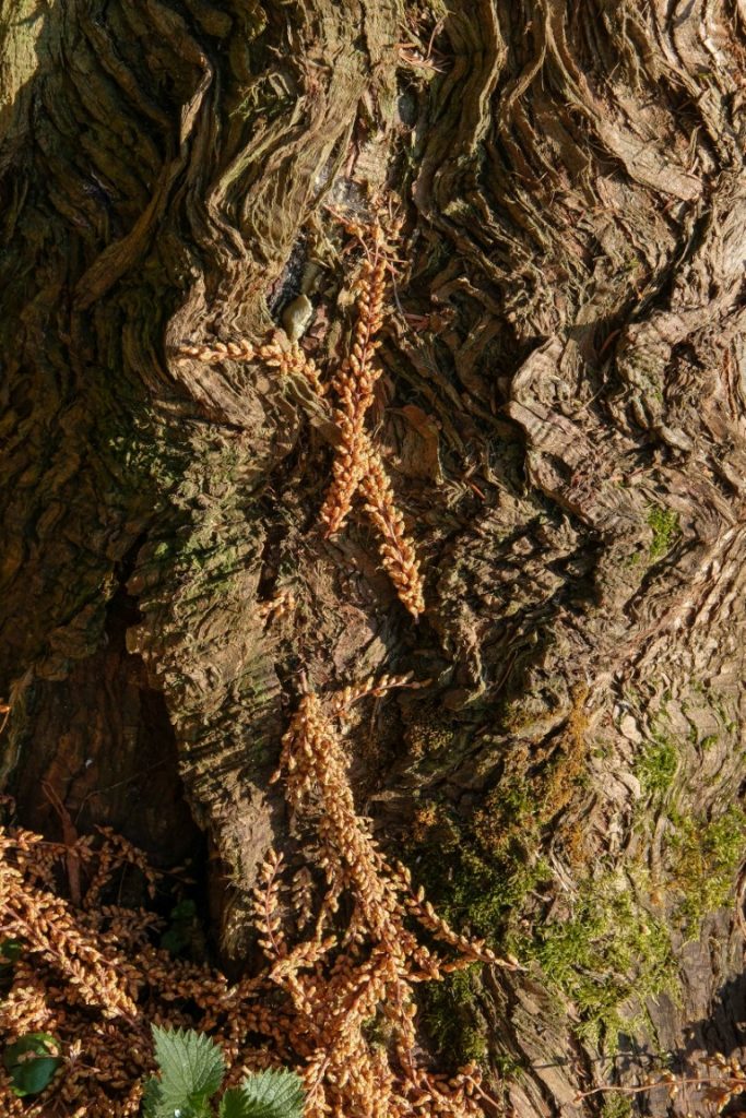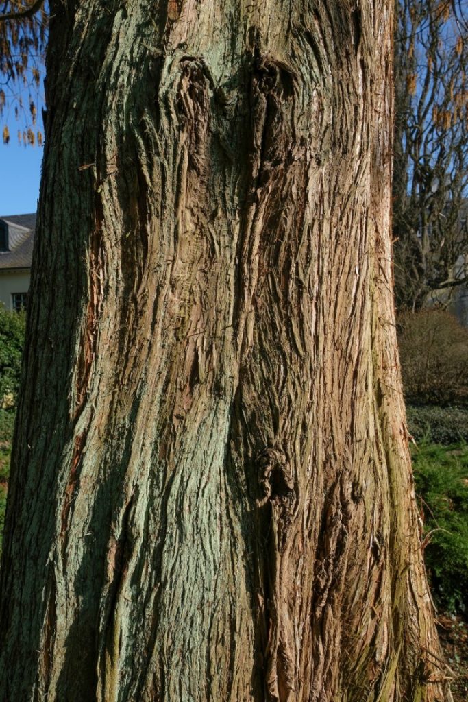 Rinde, Borke: hellorange, rotbraun, abschilfernd, später gefurcht, abschälend in Streifen, rissig; an Nodien (vom lateinischen Wort nodus = Knoten; gemeint ist der Astansatz am Stamm) stark eingekerbt; im Unterschied zur ähnlichen Sumpfzypresse mit glattem, rissigem Stamm.