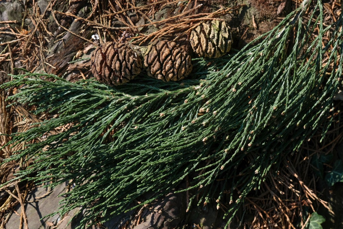 Demgegenüber sind die Nadeln des Küstenmammutbaums „Sequoia sempervirens“ zweizeilig gedrückt, wie bei Eiben. (2 Exemplare stehen im Redoutenpark)