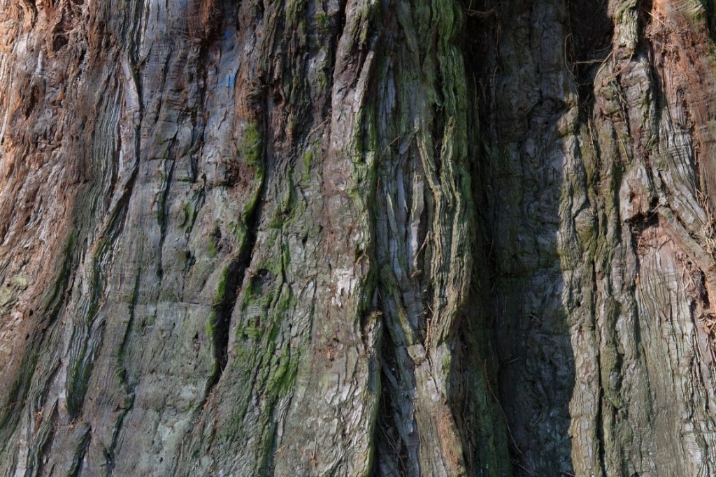Borke: Die weiche, braun-rötliche, rissige Borke kann als Schutz gegen Waldbrände bis 60 cm dick werden.